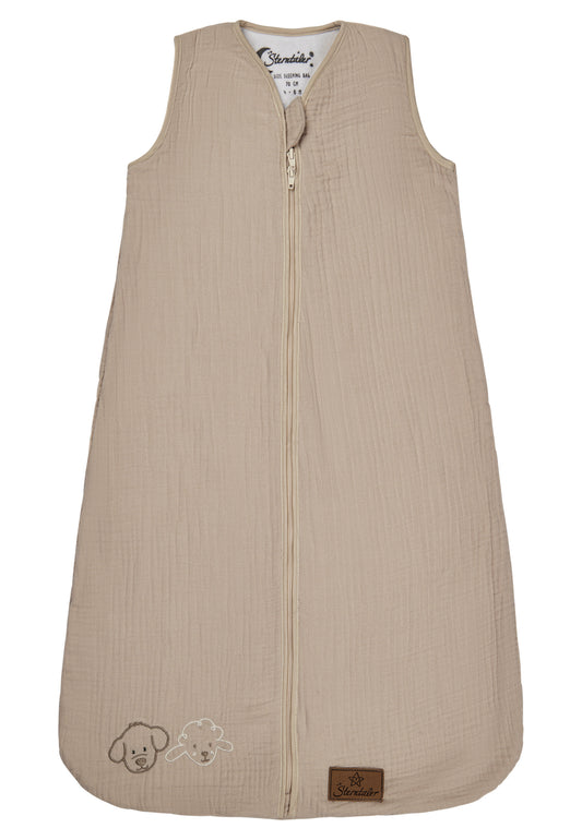Einige unserer Sterntaler Musselinschlafsäcke bestehen zu 100 % Baumwolle (Bio) und sind aufgrund ihrer Luftdurchlässigkeit besonders für sehr warme Sommernächte und -tage im Jahr geeignet. Der weiche Musselin dieser Sommerschlafsäcke schmiegt sich außerdem wunderbar sanft an zarte Babyhaut an.