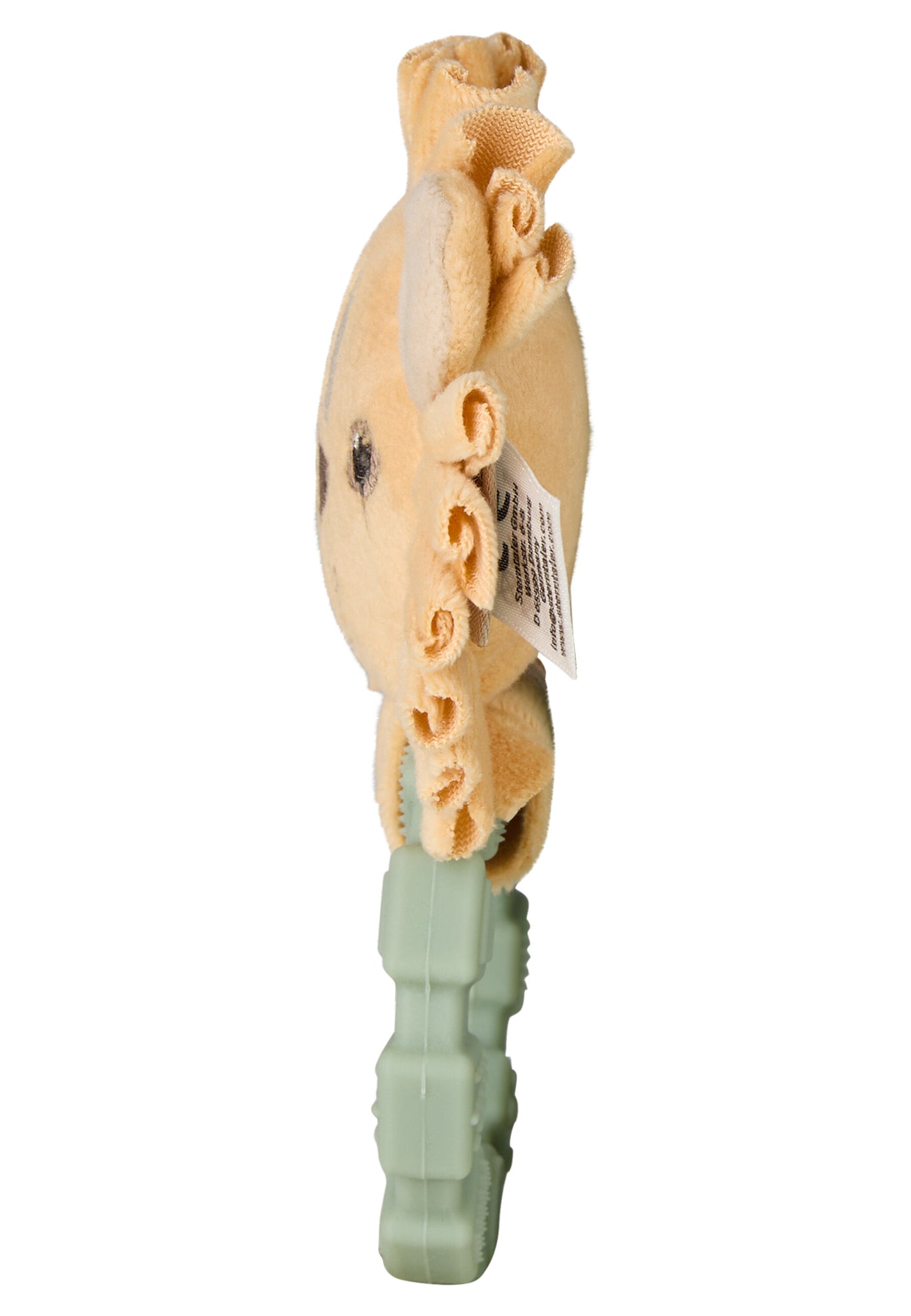 Weiche Spielfigur mit Rassel, befestigt an einem strukturierten Silikonring.