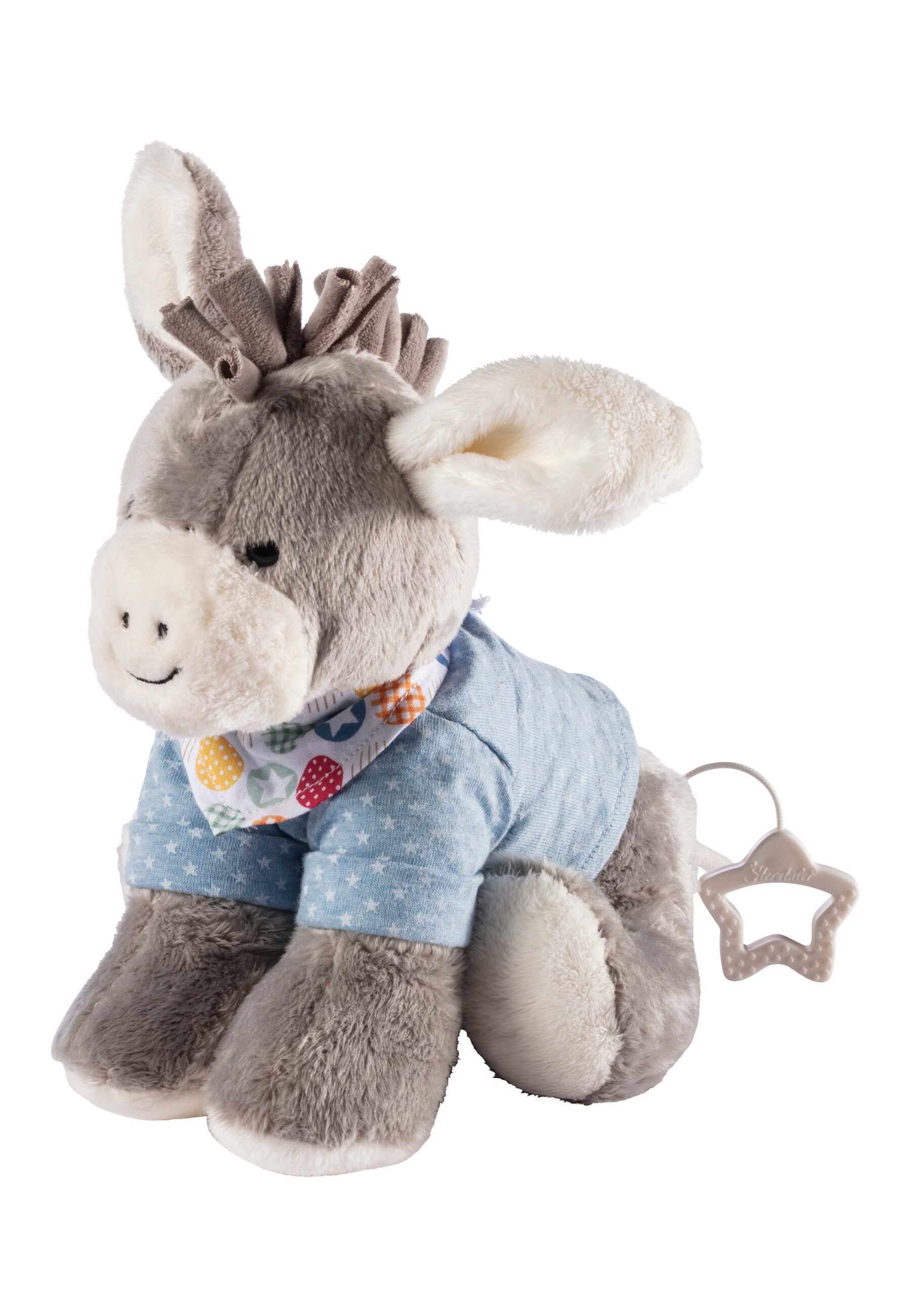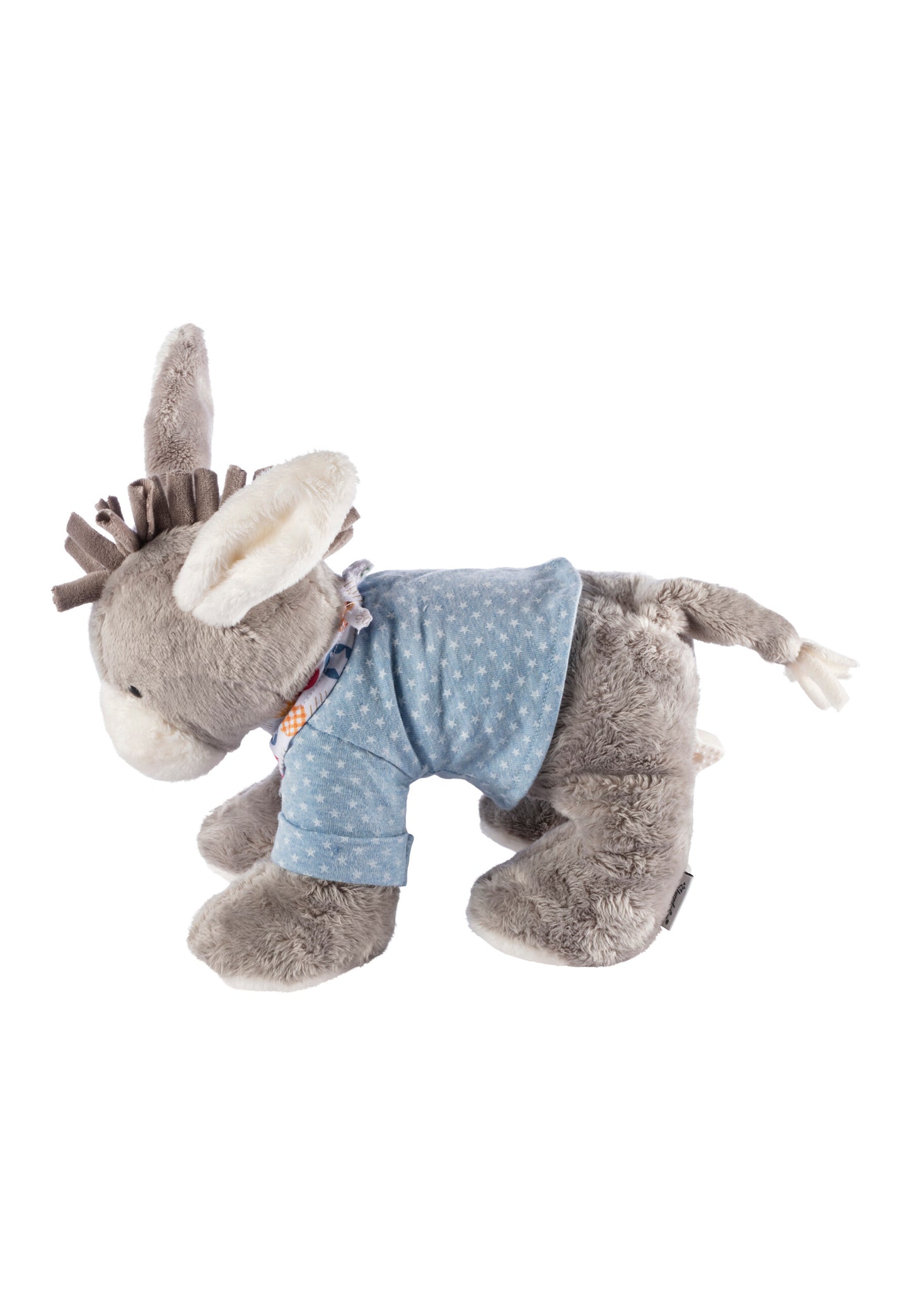 Die Spieluhr mittel ESEL Emmi mit blauem Shirt, buntem Halstuch und angenähten Ohren ist ein echter Hingucker – ideal ab Geburt und auch für größere Kinder ein kuscheliger Freund.
