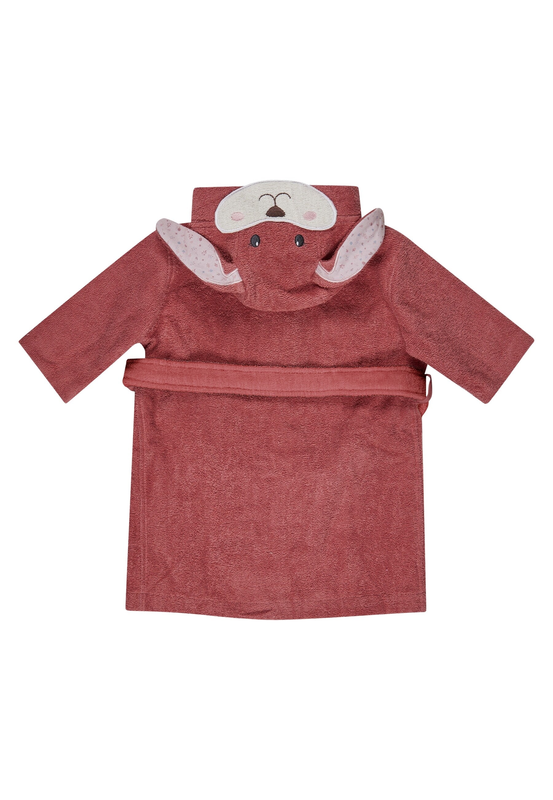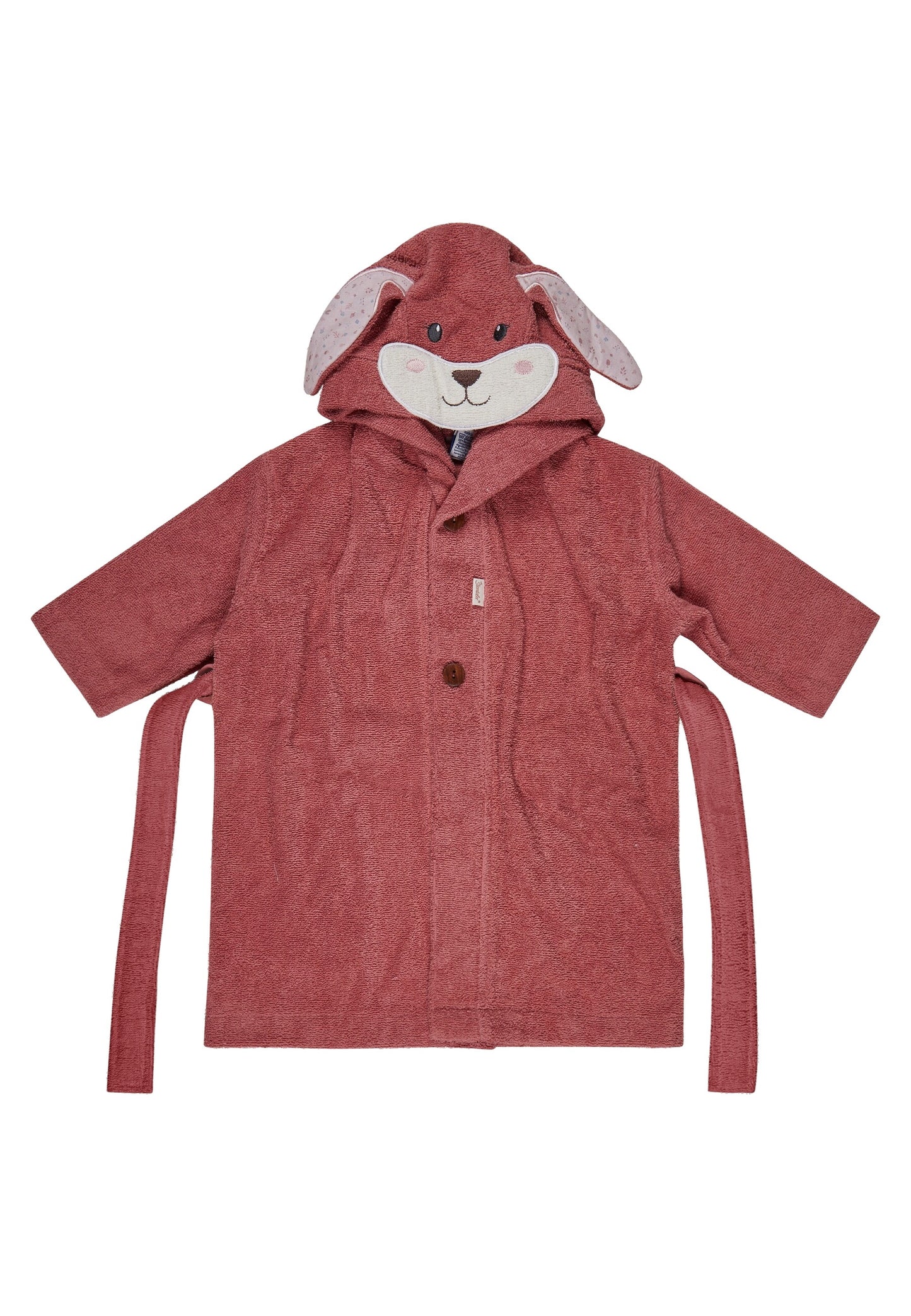 Der Bademantel Hase Hanni in der Größe 60x65 cm vereint süßes Design mit praktischen Details. Die Kapuze mit 3D-Öhrchen sorgt für einen niedlichen Look, während der abnehmbare Gürtel und Holzknöpfe das An- und Ausziehen erleichtern.