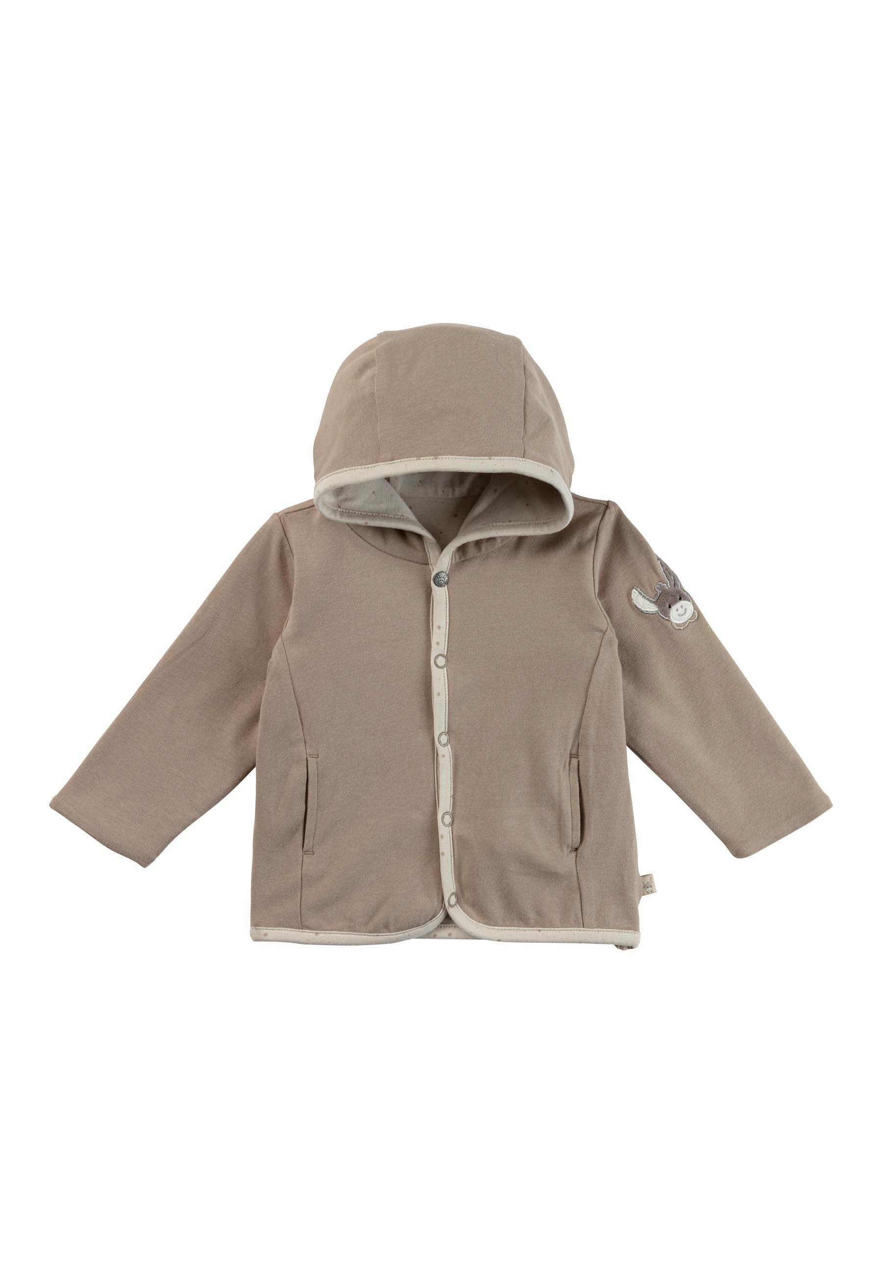 Jacke: Aus weichem Baumwolljersey, beidseitig tragbar. Eine Seite ist mit Pünktchen bedruckt, die andere uni mit seitlichen Eingrifftaschen. Die Kapuze macht die Jacke besonders gemütlich. Auf dem linken Ärmel befindet sich eine niedliche Emmi-Applikation.