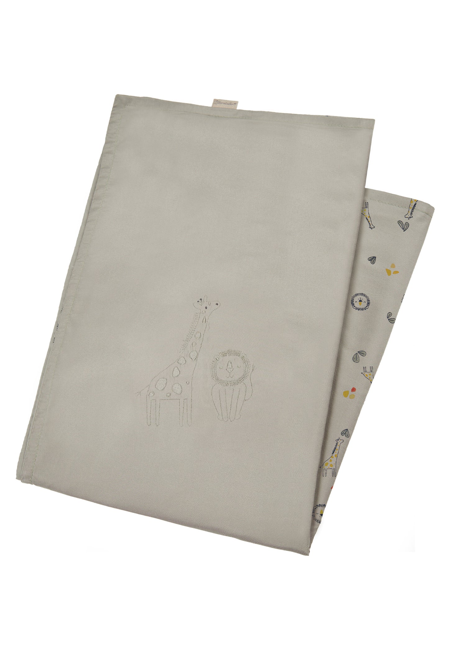 Die Vorderseite ist unifarben mit Stickmotiv von Giraffe und Löwe, während die Rückseite mit süßen Safari-Motiven bedruckt ist.