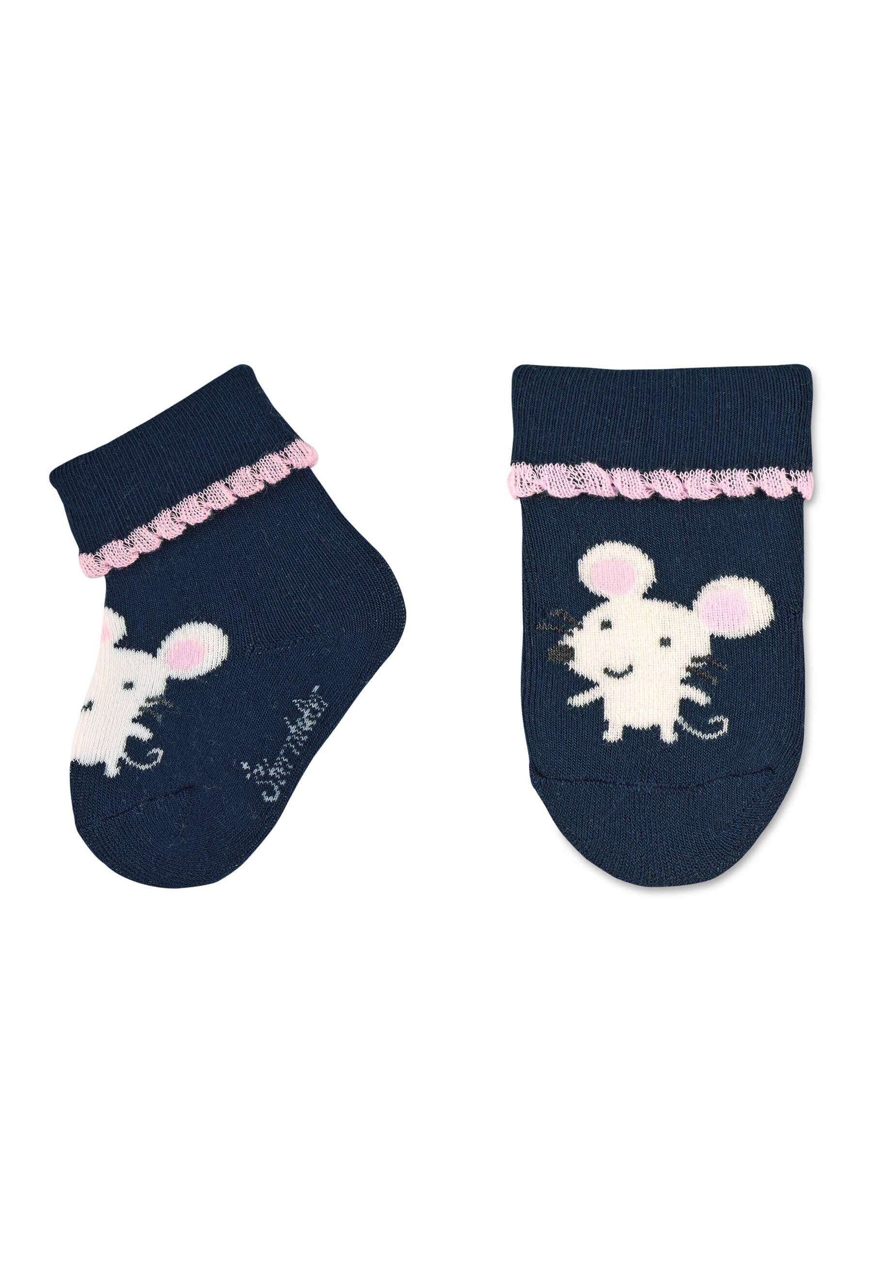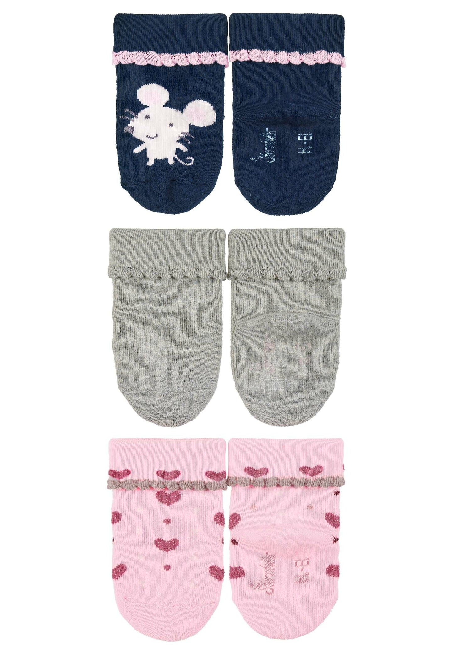 Die Babysocken im vorteilhaften Dreierpack in Marine aus Vollplüsch lassen sich super mit verschiedenen Outfits kombinieren und sind ein echtes Must-Have im Kleiderschrank deines Kindes. Die niedlichen Motive Maus und Herzen in schönen Farbkombinationen lassen kleine Mädchenherzen höher schlagen. Der hohe Baumwollanteil sorgt für wohlige Wärme und ist zugleich sehr atmungsaktiv. Der Umschlag sorgt für einen sicheren Halt ohne dabei