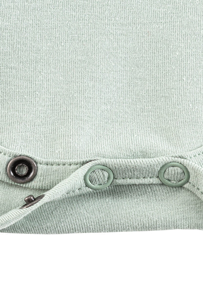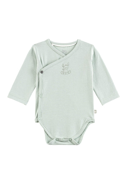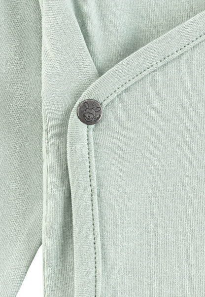 Der Langarm-Wickelbody mit weichem Baumwolljersey und gerauter Oberfläche bietet hohen Tragekomfort für kühle Tage. Der seitlich knöpfbare Wickelverschluss ist besonders praktisch beim Anziehen und wird durch Druckknöpfe im Schritt ergänzt.