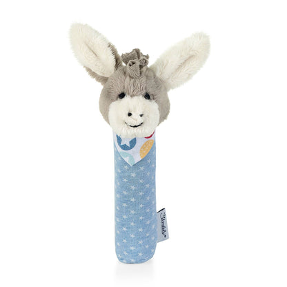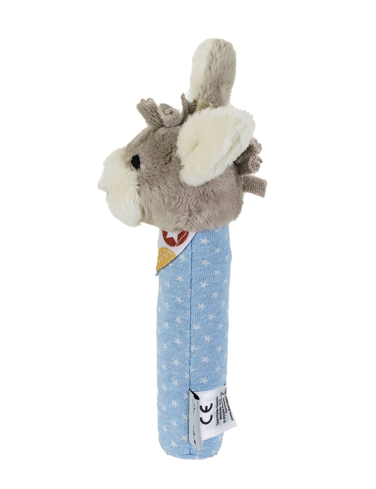 Der Stabgreifling ESEL Emmi aus Flauschstoff und Jersey ist wattiert und besonders gut greifbar für kleine Hände. Die schlichte Form erleichtert das Festhalten.