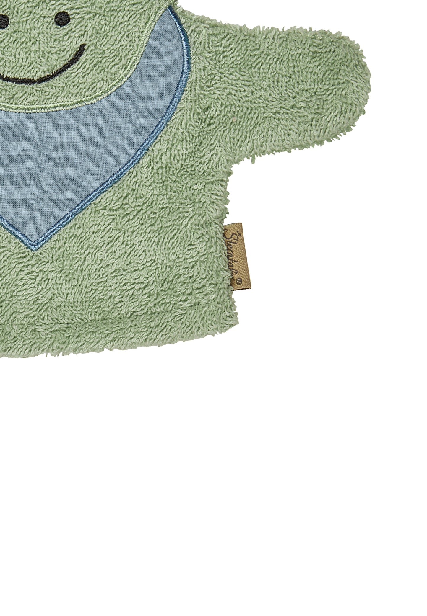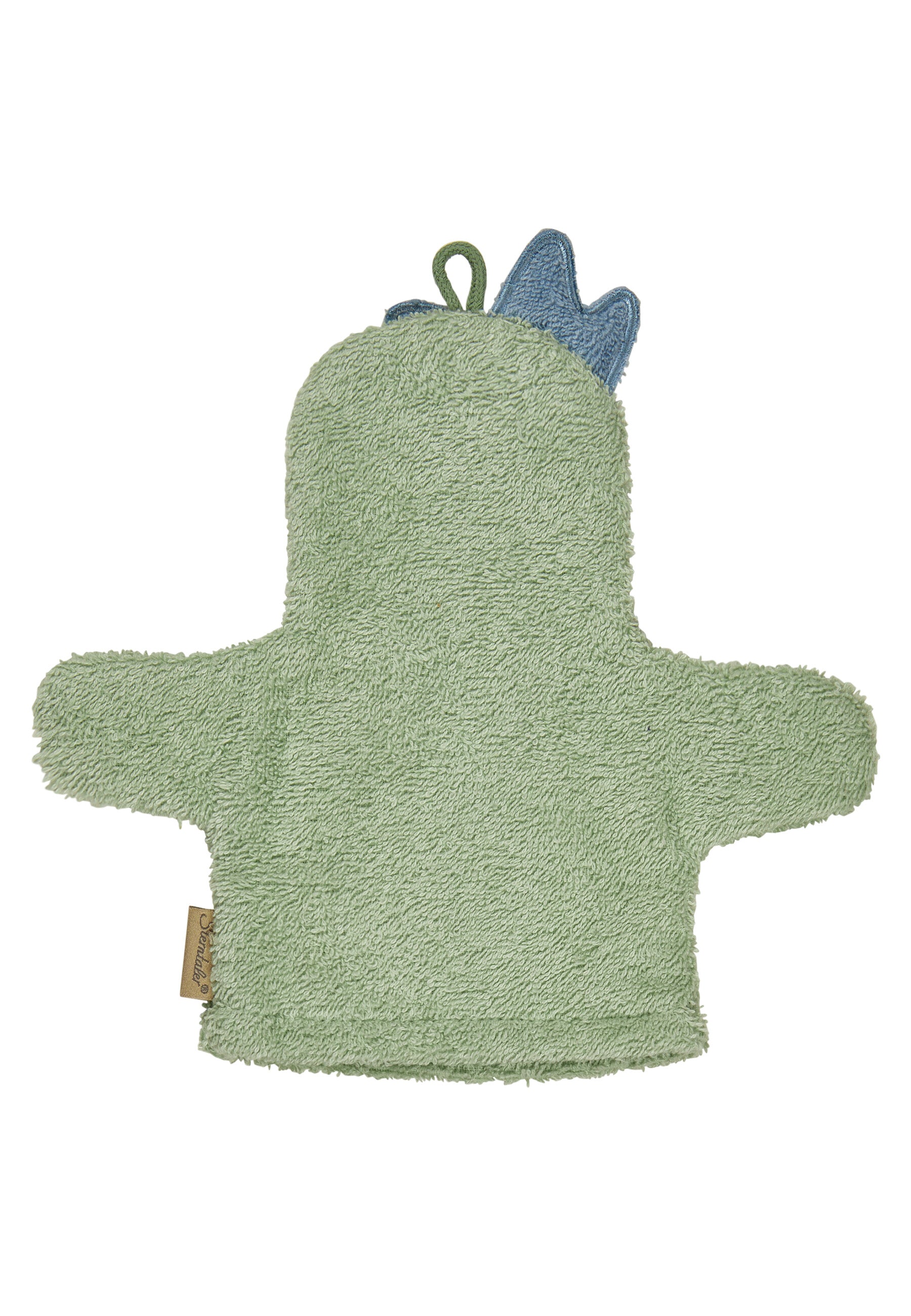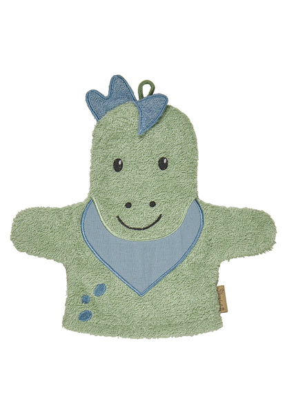 Fröhlicher WaschhandschuhDINO Rexi mit 3D-Applikation – auch als Handpuppe toll.