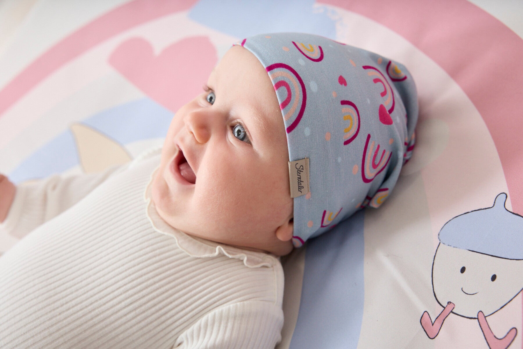 Eine leichte Mütze mit feiner Struktur und fröhlichem Motiv.