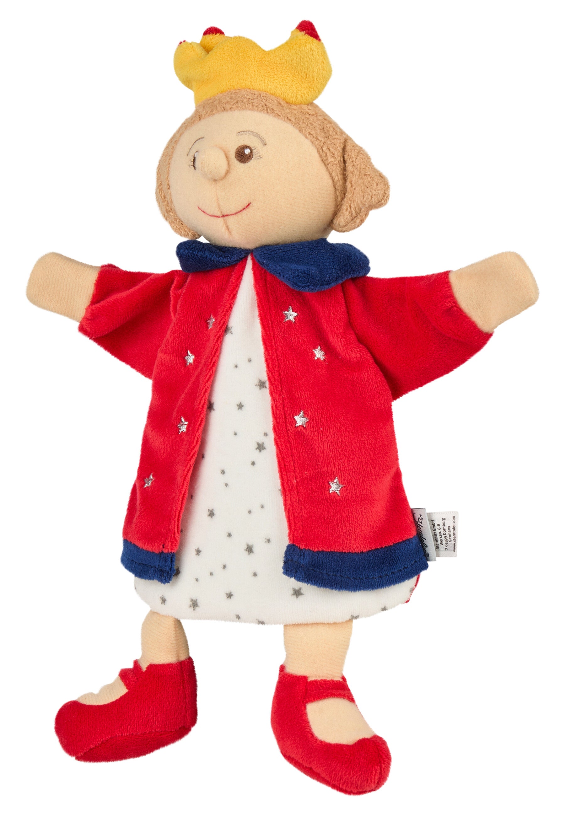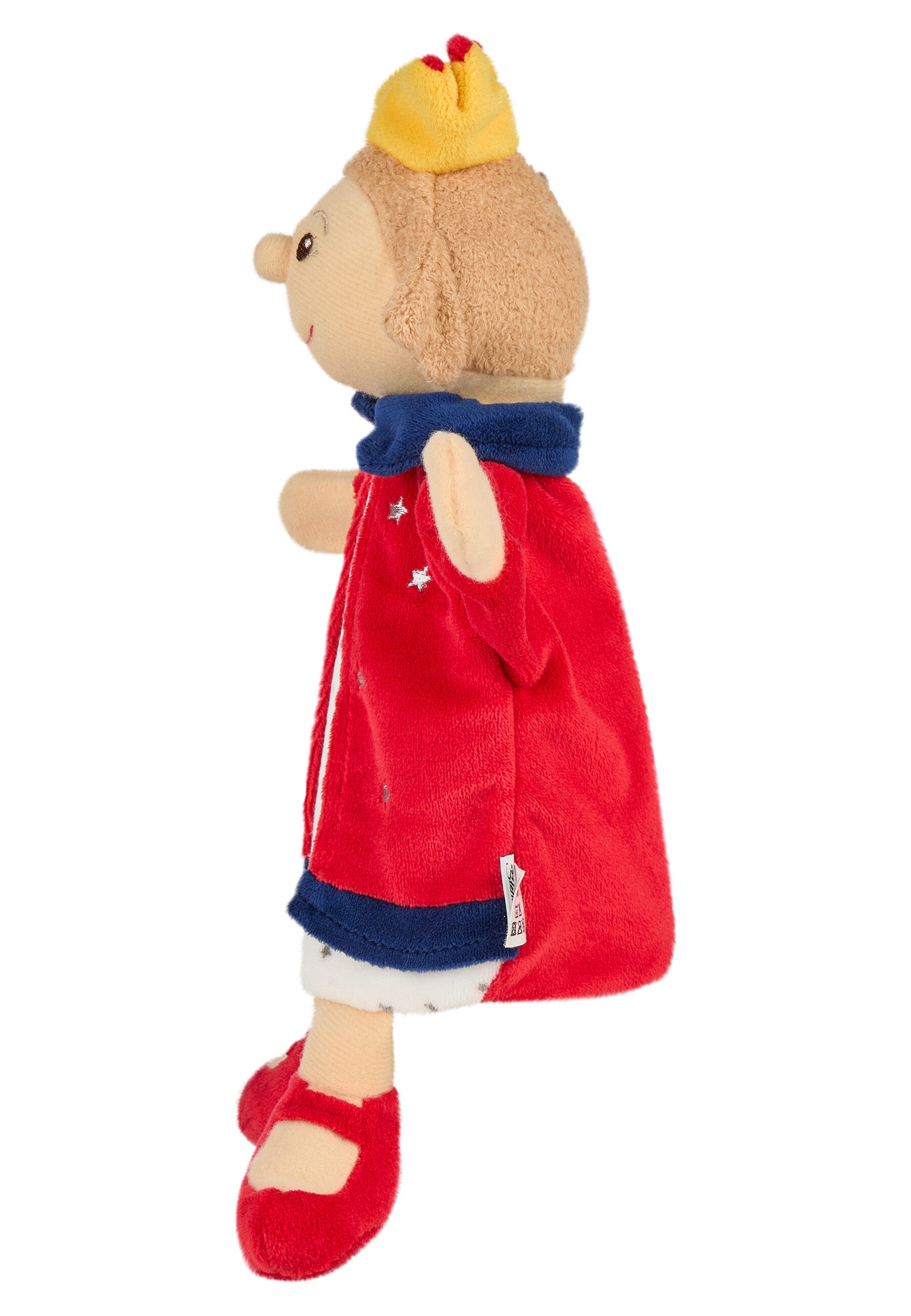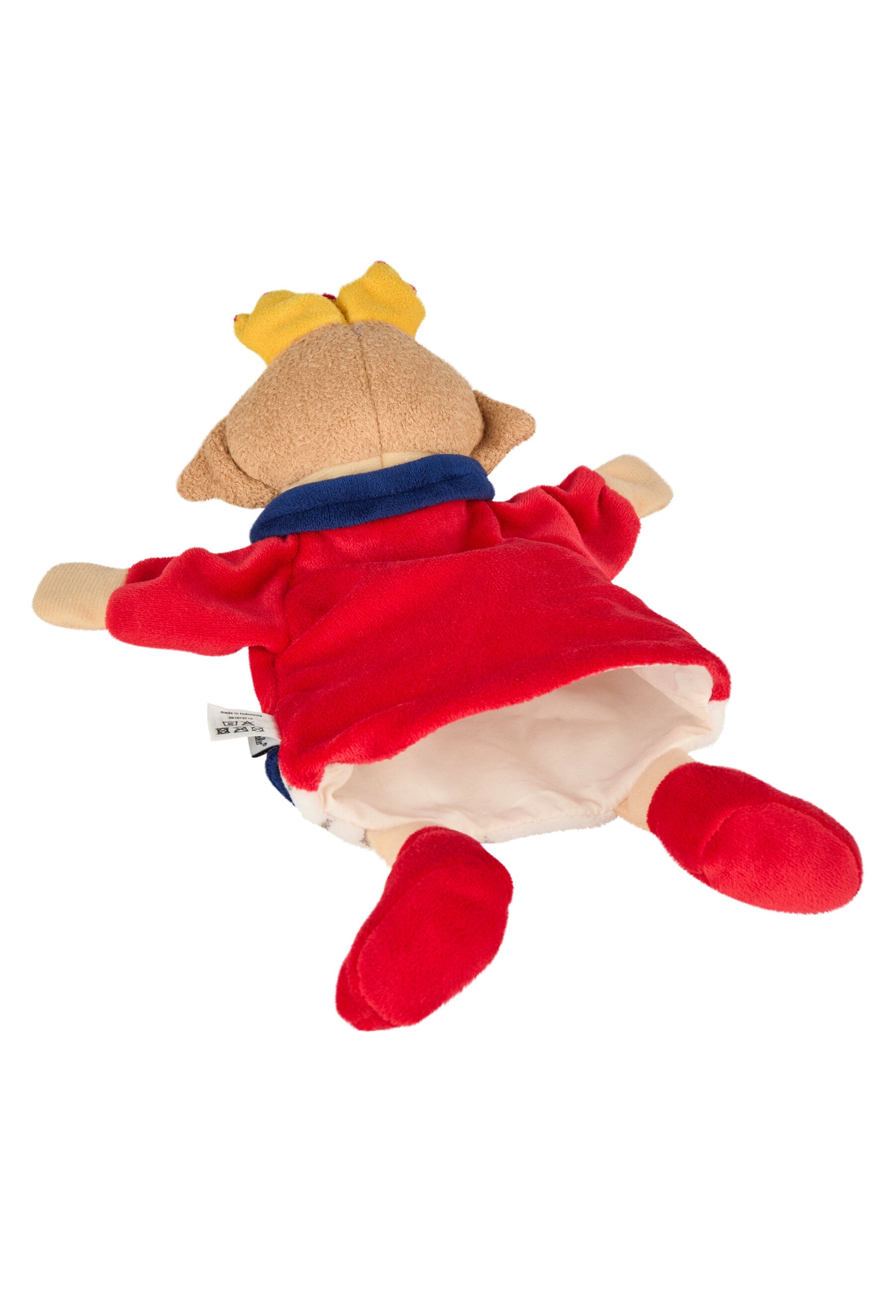 Die Handpuppe Königin aus Softvelour, Nicki und Polycotton glänzt mit Krone, Umhang und besticktem Gesicht.