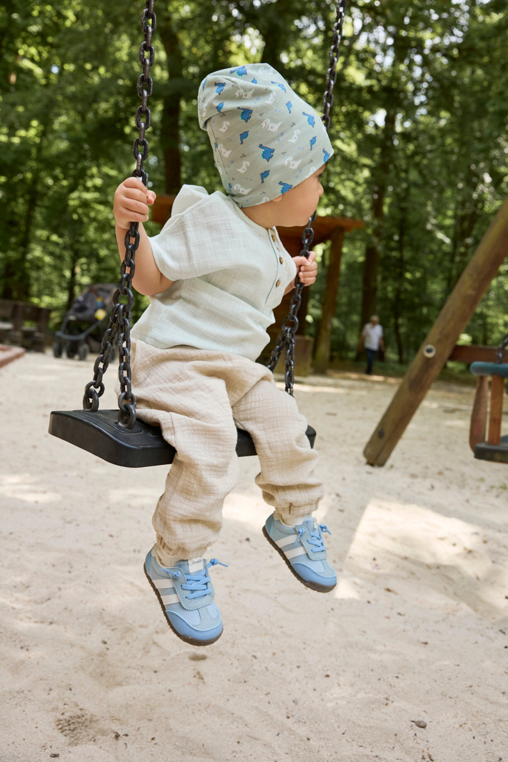 Eine weiche Beanie mit verspieltem Dinobaby-Motiv.