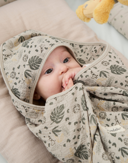 Nach dem Baden sorgt das weiche Kapuzenbadetuch für Wärme und Geborgenheit. Kleine Waschlappen und Handtücher sind ideal für zwischendurch.