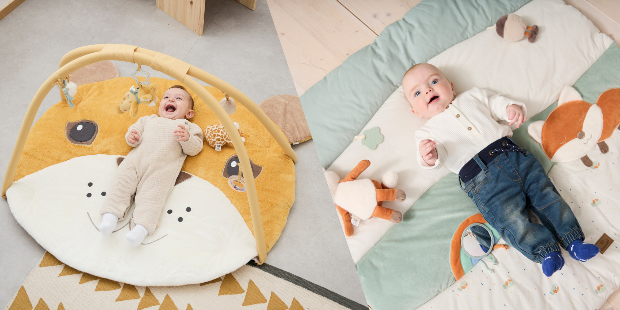 • Spielbögen mit Figuren und Rasseln fördern spielerisch die Sinne und laden zum Greifen und Staunen ein. Krabbeldecken bieten eurem Baby einen weichen Platz zum Strampeln, Drehen und Entdecken.