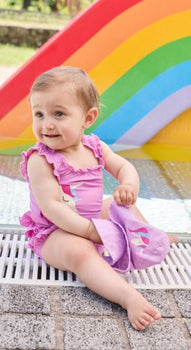 Badeanzug aus Bademodenstoff mit Elasthan /// mit Einhorn Druck /// Rüschen /// Windeleinsatz bis Größe 86/92