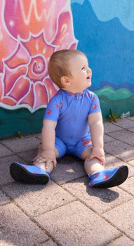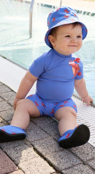 Schwimmanzug aus Bademodenstoff mit Elasthan /// mit Krabben Muster und Krabben Druck /// Reißverschluss in der vorderen Mitte /// Windeleinsatz bis Größe 86/92