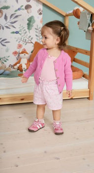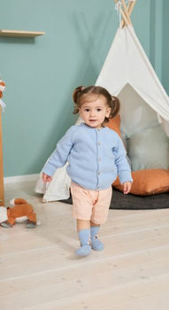 Strickjacke Struktur aus Baumwollgarn /// Knopfleiste mit Kokosnussknöpfen in der vorderen Mitte /// praktische Mitwachsbündchen können umgeschlagen oder offen getragen werden