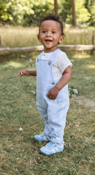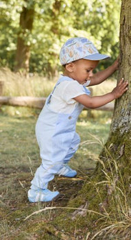 Latzhose aus leichtem veredeltem Baumwollgewebe in Leinenoptik (uni) /// Rückenteil aus Baumwolljersey /// Tasche auf dem rechten Vorderteil /// Stickerei Löwe /// Kokosnussknöpfe /// verdeckte Knopfleiste im Schritt vereinfacht das Wickeln