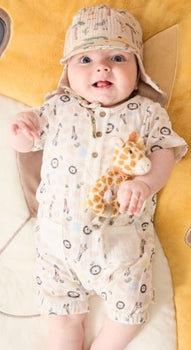 Baby Spieler /// Vorderteil und Ärmel aus leichtem veredeltem Baumwollgewebe in Leinenoptik bedruckt mit Safari Druck /// Rückteil aus Baumwolljersey bedruckt mit Safari Druck /// Halsausschnitt vorne geknöpft /// 2 aufgesetzte Taschen /// Knopfleiste im Schritt erleichtert das Wickeln