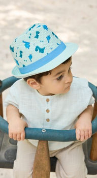Strohhut /// bedruckt mit Dinos /// leicht /// atmungsaktiv /// Sonnenschutz /// Garniturband an Krempe /// Krempe hinten nach oben gebogen
