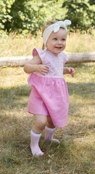 Kleid /// Rockteil aus leichtem veredeltem Baumwollgewebe in Leinenoptik (uni) /// Oberteil aus Baumwolljersey bedruckt mit Hasen /// mit Flügelärmeln /// bequeme Weite durch Raffung im Rockteil /// beide Schultern zum Knöpfen /// kleine Zierschleife am Halsausschnitt in der vorderen Mitte